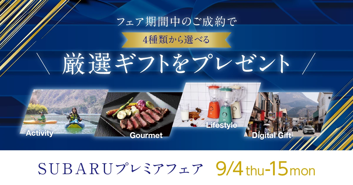 2024/11/21~12/1の期間中にSUBARUで新車を成約すると、普通車で3万円相当、軽自動車で1万円相当のギフトプレゼントがあるフェア開催中とのこと。